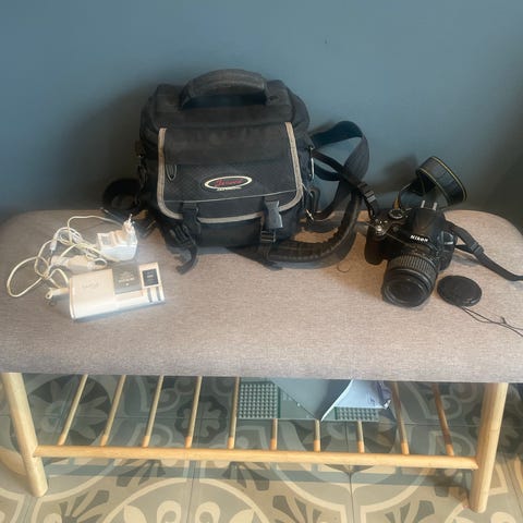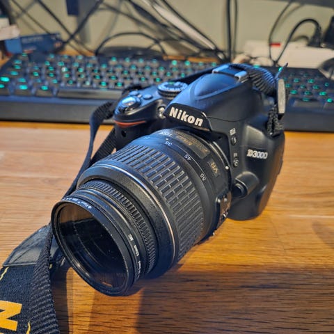 Nikon D3000 speilreflekskamera fra tidlig 2000-tallet selges. Komplett med kameraveske, 18-55mm linse, batteri, 8GB minnebrikke (ferdig formatert), lader til batteri og kabler til overføring av bilder.