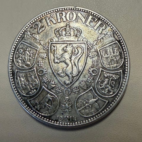 Norges Bank 2 kroner minnemynt fra 1914 i sølv Forsiden viser riksvåpenet med løve og krone, samt påskriften «2 kroner» og «Norge» med årstallet 1914.