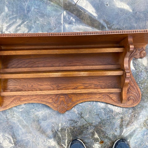 Eldre vegghengt hylle i tre av furu eller eik. Kan minne om modell fra Vaglauer eller lignende rustikk stil.