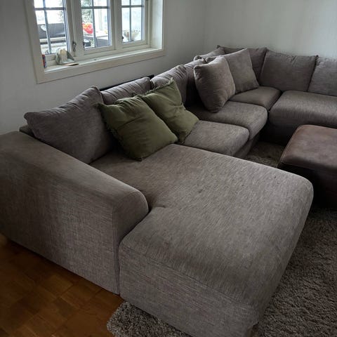 Mørk grå u-sofa med sjeselong gis bort mot henting. Sofaen fremstår som helhetlig pen med normal bruksslitasje og noe nuppete på enkelte puter. Noen bruksmerker her og der. Putene er litt nedsittet på begge sider av sjeselong, men er ikke veldig merkbart.