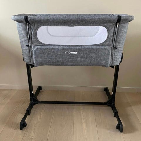 Moweo bedside crib babyseng i grå tekstil med hvit innerside. Sengen har nettingfelt på siden som gir innsyn og lufting. Stabil ramme i metall med justerbare ben og hjul for enkel flytting. Egnet som babyseng ved siden av voksenseng eller som frittstående seng til spedbarn. Madrass følger med etter det som vises på bildene.