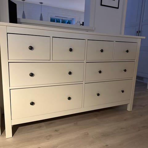 Meget pen Hemnes kommode m/ 8 skuffer selges. Nyprisen på denne for ca 10 år siden var kr 5 000. Må hentes med en stor varebil / henger. Skuffene er tatt ute. Så den er ikke så tung å bære nå. Men husk på å ta med en bærehjelper. Vipps oppgjør.