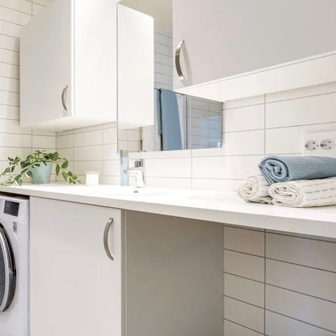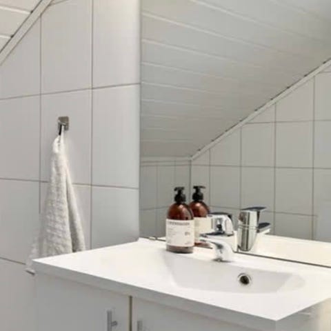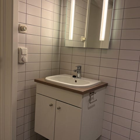 Badromsinnredning med speil, vask, lys, sideskap