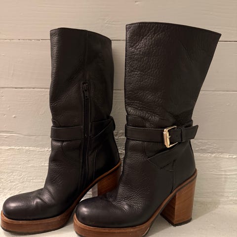 Nude of Scandinavia støvler i størrelse 39. Støvler i svart skinn med høy blokkhæl og platåsåle. Modellen har spenne- og stroppedetaljer rundt ankelen og glidelås på innsiden for enklere av- og påkledning. Overdel i skinn og kraftig hæl gjør dem egnet til bruk i kjøligere sesonger og til både hverdags- og penere antrekk for dame.