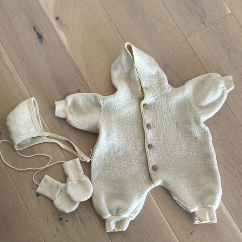 Nøstebarn ulldress for baby i størrelse 50, unisex. Dressen er i grå ull og har hette og lange ermer og ben. Den lukkes med knapper foran. Materialet er 100 % ull, som gir god varme og er egnet som ytterlag eller mellomlag på kjølige dager. På bildene følger det også med en matchende grå ulllue i samme stil. Passer til nyfødt og de aller minste. Brukt opp til ca 4-5 måneder her. Aldri vasket, så ikke noe tovet i stoffet. Naturlig selvrensende, men uten hull eller flekker.