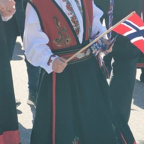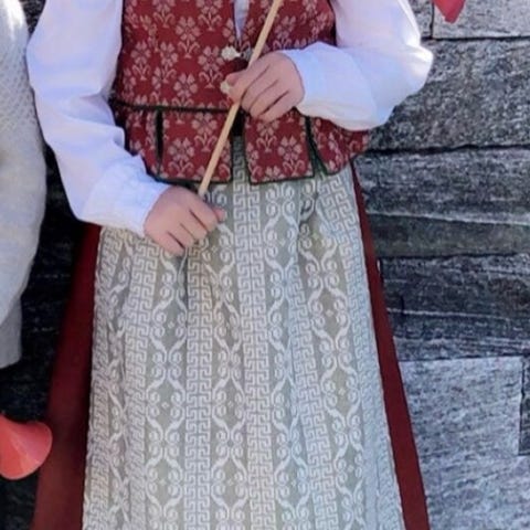 Bunaden er i ulldamask. Den er i ca str 36 og nå tilpasset høyde 172cm. Kan legges ut til str 40, kanskje 42. Materialpakke kjøpt på Tynset. Profesjonelt sydd av person med bunadskompetanse. Vesten er håndsydd. Ingen bruksmerker. Det som selges er stakk, liv(vest), forkle, veske uten lås, silketørkle og underskjørt.