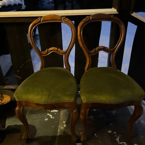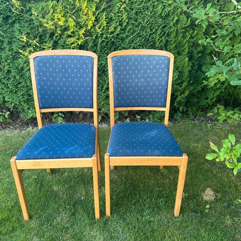To godt brukte kjøkkenstoler fra det glade og noe (interiørmessig) brune 70-tall. Disse har sett bedre dager, og drømmer om å gjøre nettopp det igjen - kanskje under din kjærlige restaurerende hånd, eller i hvert fall en god rens av fordums praktfulle stoltrekk.