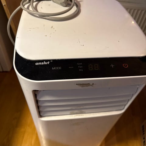 Point portabel aircondition med kjølekapasitet på 11 000 BTU. Enheten er hvit og leveres med fjernkontroll. Energiinformasjon på etiketten viser kjøle- og varmefunksjon med angitt effekt og energiklasse. Lydnivået er oppgitt til 65 dB. veldig lite brukt.