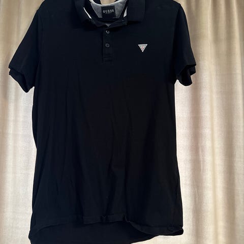 GUESS T-skjorte for herre i størrelse L. T-skjorten er svart og laget av bomull. Den har kort erm og rund hals. På brystet er det et lite, trekantet GUESS-logoemblem. Passer til hverdagsbruk og kan kombineres med både jeans og shorts.