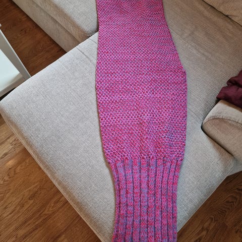 En nydelig hjemmestrikket Klara kosepose, beregnet fra nyfødt-5 mnd. Vært brukt i vognposen i vogna, for ekstra varme. Pent brukt.