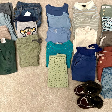 Stor klespakke til gutt i størrelse 86. (Noen få plagg er str 80 eller 92, men brukt samtidig). Mye er pent brukt og noe er mer brukt med noe slitasje. Jeg har ikke oppdaget hull eller flekker på klærne, bortsett fra en ullbody og ullstillongs (se bildet) men noe småtteri kan forekomme. Noen klær med små hull/flekker er avbildet på de siste bildet, og kan følge med hvis ønskelig.