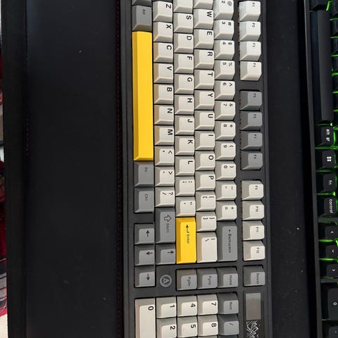 Tastene er veldig digge å skrive på ikke klikkete. Har en rolig smooth thump når du trykker. Batteriet og trådløs funksjonen har ikke funket i mitt eie. Jeg fikk det kjøpt brukt som gave så fikk aldri snakket med den gamle eieren om batteriet. Har brukt usbc kabel tilkobling (den følger ikke med). Selges siden jeg har gått over til splitt tastatur. Det er best å hente siden den må sendes som «Medium» pakke. Den er 46x17x7cm