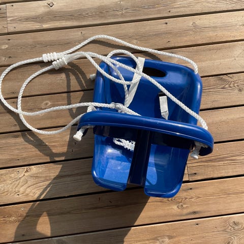 Blå huske til barn med høy ryggstøtte og frontbøyle. Husken er laget i plast og henger i tau som kan festes i krok eller huskestativ. Egnet for små barn som trenger ekstra støtte når de sitter. Passer til bruk både inne og ute der det er egnet oppheng.