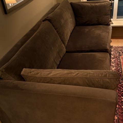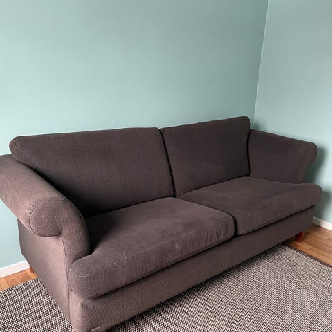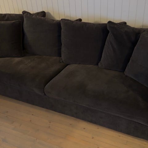 3-seter i mørk grå/blå velour/mikrofiber, med brede armlener og ganske moderne, enkel stil.