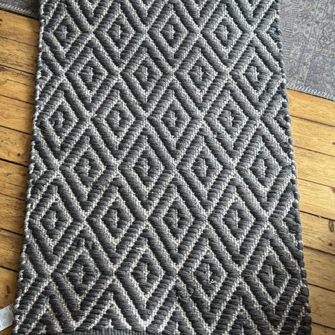 Håndlagde liten teppe, diameter ca 50 cm. Passer til en stol, en benk, til baderom.