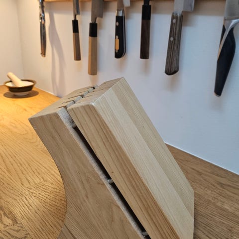 Knivblokken er laget i lyst treverk og har spor i toppen for oppbevaring av flere kniver. Den står støtt på benken ved hjelp av en metallstøtte på baksiden. Egner seg til organisert og lett tilgjengelig oppbevaring av kjøkkenkniver på kjøkkenbenken.