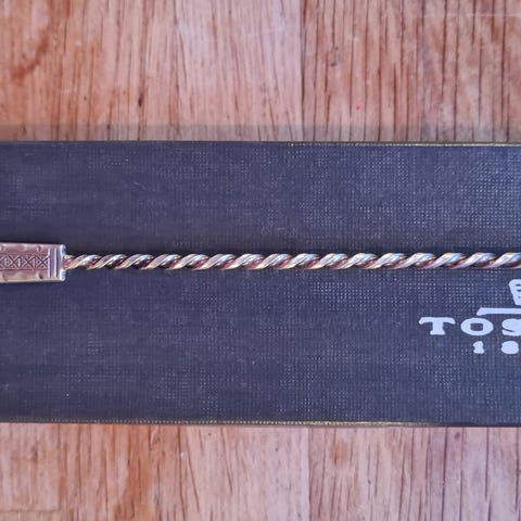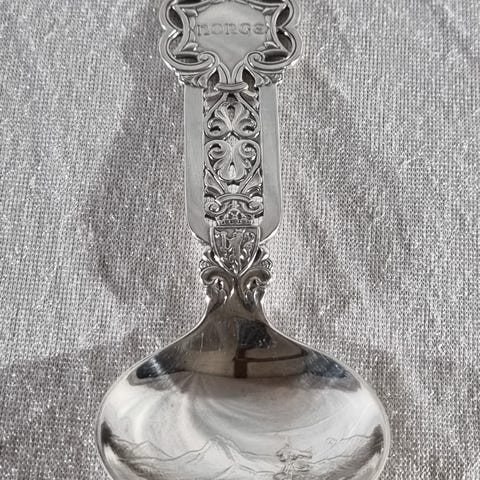 J. Tostrup Brudekrone skje i 830 sølv. Skaftet har dekor med skihoppermotiv på forsiden og Brudekrone-mønster i toppen. Skjeen er stemplet 830S med produsentstempel og norsk kontrollmerke for sølv. Egner seg som del til servering eller som samleobjekt.