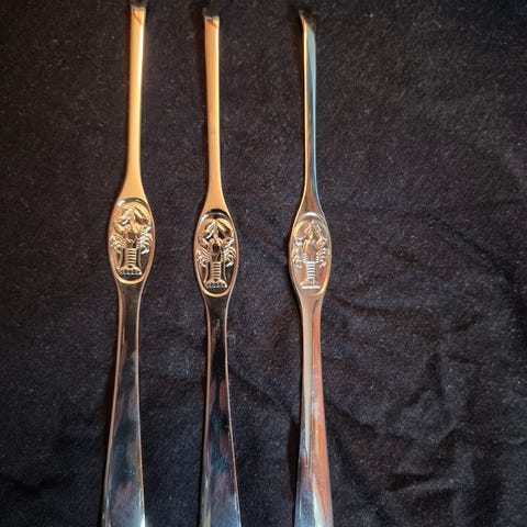 Ukjent merke sølvplett hummergafler med motiv, sett med 6 stk. Gaflene har to tinder i enden og ovalt skaft med preget motiv på midten. Merket med «60 g.» på baksiden, som angir sølvplettbelegg. Egnet til servering av skalldyr som hummer og krabbe, eller som små serveringsgafler til forretter og snacks.