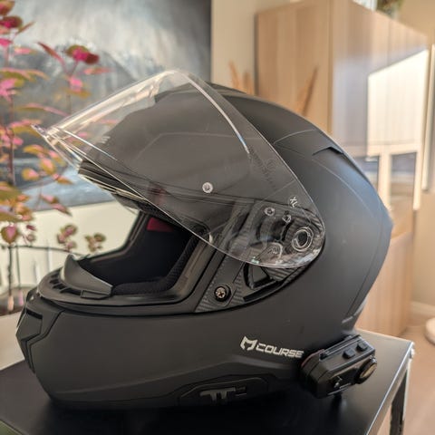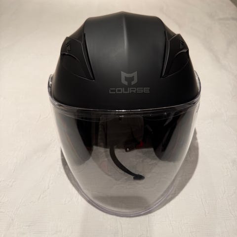 Course helhjelm for MC i svart matt utførelse med klart yttervisir og integrert solvisir. Hjelmen har ventilasjonsåpninger i front og topp, samt hurtigspenne under haken. Innredningen er polstret for økt komfort. På siden av hjelmen er det montert et Sena Bluetooth-intercomsystem. Passer til motorsykkelbruk der helhjelm er ønsket, og gir mulighet for kommunikasjon via Sena-enheten som er festet til hjelmen.