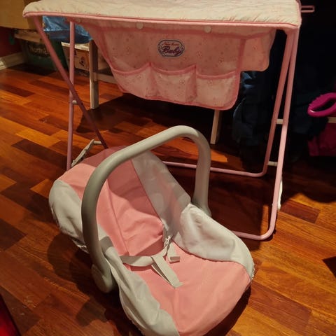 Selger et stellebord fra Bebellino. Det er også et sete dukken kan sitte i og et skap der man kan henge klær eller plassere utstyr. Stellebordet har også en vask og et sted der dukken kan bade.