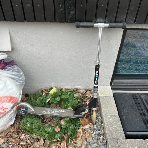 Har stått fuktig i garasjen, så den må ha en grundig vask før videre bruk.