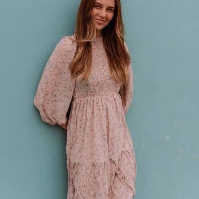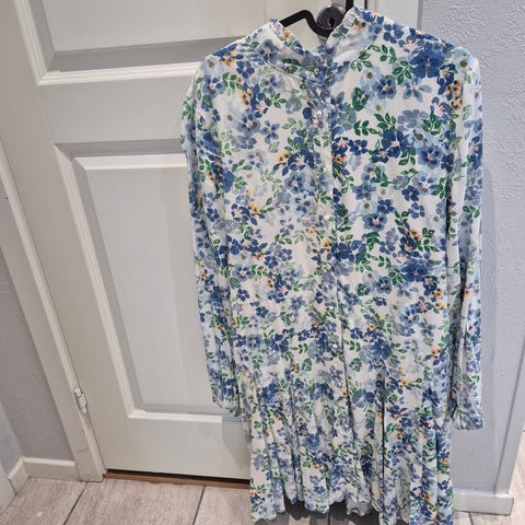 Floyd kjole i størrelse M. Kjolen er i viskose og har et flerfarget blomstermønster med mørk bunnfarge og lyse små blomster. Modellen har korte ermer og lett utsvingt skjørt som rekker til over kneet. Stoffet er mykt og faller lett langs kroppen. Passer som hverdagskjole eller til enkle anledninger.