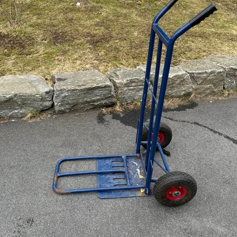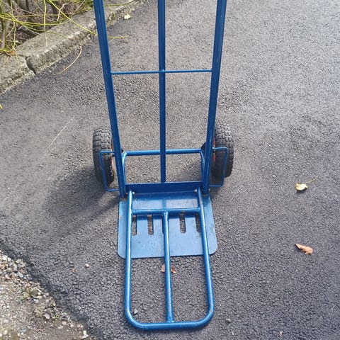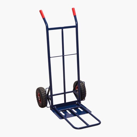 Blå sekketralle med stålkonstruksjon og luftgummihjul. Trallen har solid lasteplate nederst og høyt håndtak for god støtte ved transport av esker, sekker eller annet gods. Egner seg til flytting og transport av tyngre gjenstander på jevnt underlag. Hjulene er mønstrede for bedre grep på underlaget.