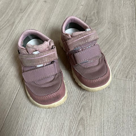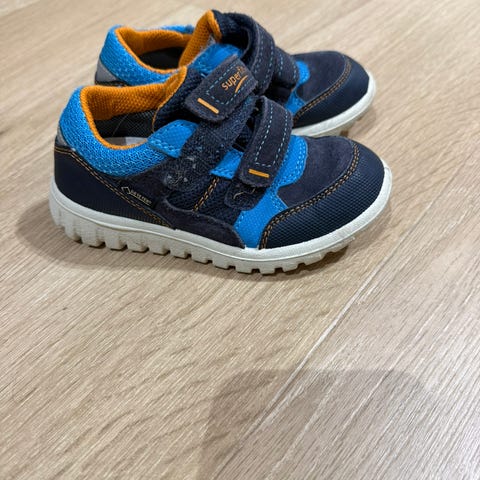 Gore-tex sko fra Superfit, størrelse 26. Modellen har borrelås og elastiske lisser for enkel av- og påkledning. Overdelen er i tekstil og syntetisk materiale med tydelige sømmer, og innsiden har mykt tekstilfôr i blått. Yttersålen er mønstret for godt grep. Minimal slitasje på skoene, som er brukt én sommer/høst.