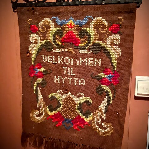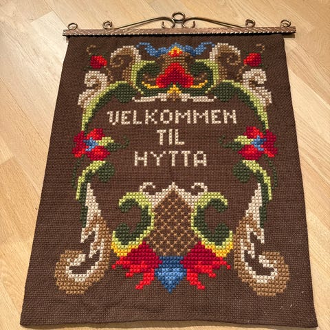Velkomsttavle med teksten «Velkommen til vårt hjem» brodert med klostersøm. Med tradisjonelt norsk mønster. Med fint smijernsbeslag.