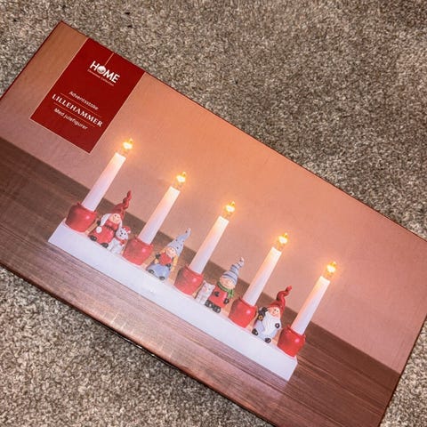 Rusta elektrisk julelysestake med innebygd snøglobe. Halvsirkelformet lysestake med flere LED-lys på toppen og gjennomsiktig front med julemotiv av nisser, trær og snølandskap. Selges i to varianter, én rød og én hvit. Egnet som innendørs juledekorasjon på bord, hylle eller vinduskarm. Drives elektrisk via ledning .