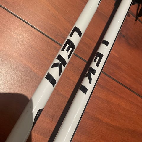 Leki langrennstaver lengde 120 cm med håndstropp i rosa og gul farge. Stavene har ergonomiske håndtak med avtagbare håndstropper merket størrelse XS.
