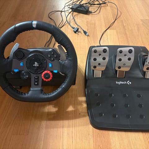 Selger et komplett Logitech G29 Driving Force racing-oppsett med ratt, pedalsett og girskifter.