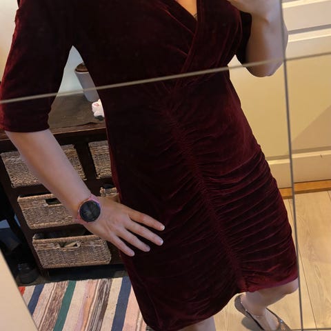 Den lille røde kjolen. Dyp utringing både foran og bak. Innlegg i brystdelen. Sitter godt på. Veldig behagelig og med stretch. Str. 36