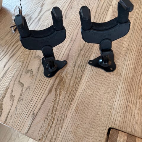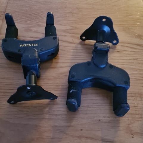 Veggfeste gitarholder i svart plast og metall. Holderen har polstrede armer for å beskytte halsen på gitaren, og en brakett for montering på vegg. Egnet for oppheng av gitar eller lignende strengeinstrument på vegg for trygg oppbevaring og enkel tilgang.
