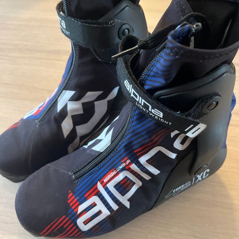 Alpina SKATE i størrelse 38. Sort med røde detaljer og høy ankelstøtte med hælkappe for bedre stabilitet. Frontåpning med glidelås og borrelåsrem over vristen.
