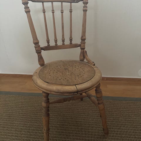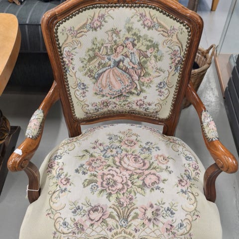 Lenestol i tre med polstret sete og rygg. Stolen har buede armlener og utskårne detaljer i treverket. Sete og rygg er trukket i et mønstret stoff i grå ,grøn og bronse/gulltoner med ornamentalt motiv. Stoffet har bånd langs kantene og er festet med dekorative nagler rundt rygg og sete. Egnet som sittemøbel i stue, soverom eller som stol i entré eller lesekrok.