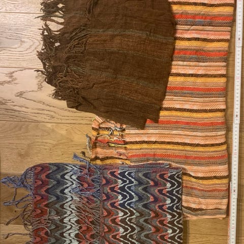 Hjelper mormor å rydde i leiligheten og selger noen av skjerfene. De er laget i Italia og er i polyester, ikke ekte silke.