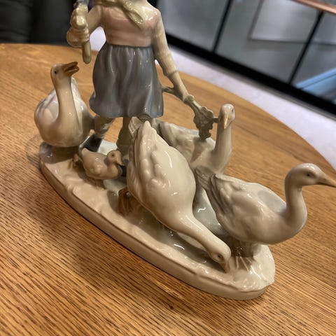 Porselensfigur som forestiller en gutt sammen med to gjess. Figuren er i hvitt og blått porselen, med gutten kledd i kortbukse, skjorte og lue. Motiv på sokkel med naturdetaljer.