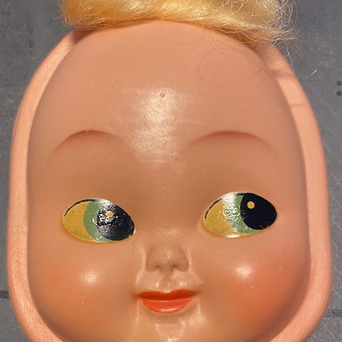 Dukkehode i hvit keramikk med malt ansikt og hår og en tåre på kinnet. Hodet har grønne malte øyne og rød munn.