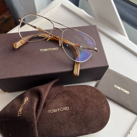 Tom Ford briller for dame med transparent beige/rosa innfatning. Modellen har lett, buet ramme med hel innfatning rundt glassene og klassisk Tom Ford-logo på stengene. Brillene leveres med etui fra Tom Ford, som gir beskyttelse ved oppbevaring og transport. Egner seg som hverdagsbriller eller lesebriller etter tilpasning hos optiker.