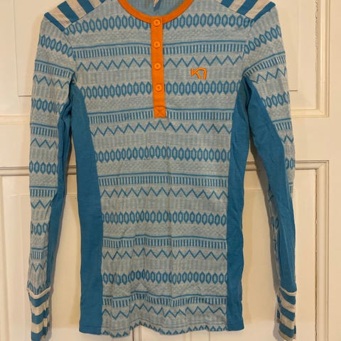 Kari Traa ulltrøye for dame i størrelse XS. Trøyen er laget i 100% merinoull og har et svart mønster med kontrastdetaljer. Langermet modell med rund hals. Egner seg som innerste lag til hverdagsbruk og ulike utendørsaktiviteter der ull ønskes mot huden.