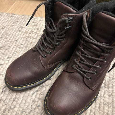 Dr. Martens støvler i størrelse 38. Støvlene er laget i brunt skinn med snøring foran og karakteristisk gul søm langs sålen. Innsiden er fôret med mykt, syntetisk pelsfôr for ekstra varme. Yttersålen er kraftig og mønstret for bedre grep. Passer som hverdagsstøvler i kjøligere vær.