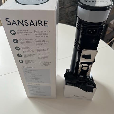 Menuett Sous Vide-sirkulator. En stavsirkulator for sous vide-tilberedning av mat i vannbad. Enheten festes på kanten av en gryte eller beholder og sirkulerer og varmer opp vannet til en jevn og presis temperatur. Passer til tilberedning av blant annet kjøtt, fisk og grønnsaker i vakuumpakker. Strømtilkoblet kjøkkenapparat for innendørs bruk.