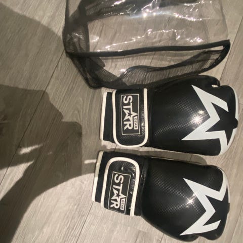 Selger et komplett sett med Krabon boksehansker (14 oz), leggbeskyttere i stÞrrelse M og hÄndwraps i rÞdt og hvitt. Utstyret er brukt i ca. 6 mÄneder. Perfekt for de som vil starte i Muay thai, kickboxing eller boxing.
