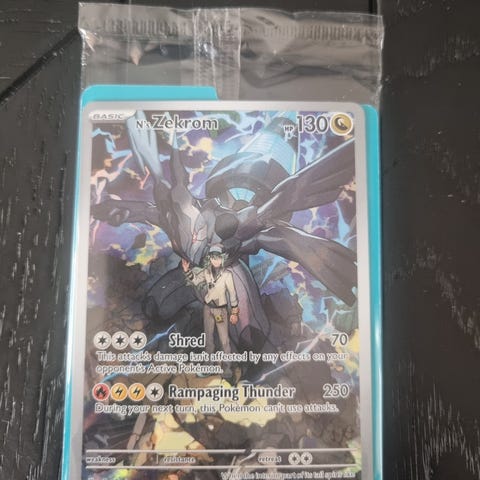 Pokémon N Full Art Zekrom. Super kult kort med kule detaljer. Selges med sleeve og toploader. Pris kan diskuteres. Har to hvis noe øsnker å kjøpe begge