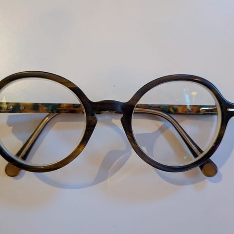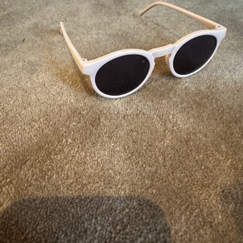 Jeg selger her et par Marimekko solbriller. De er røde foran og har brune armer. Solbrillene har styrke, men dette kan vanligvis lett byttes ut av en optiker. Jeg vil anta at det var rundt -0,75 og -0,5, men jeg er ikke helt sikker.