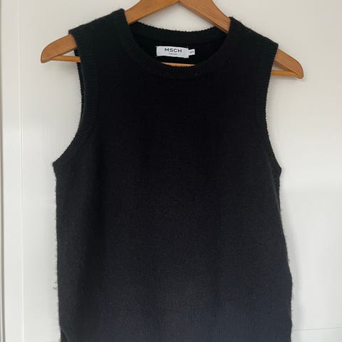 & Other Stories ullvest for dame i størrelse M. Vesten er i svart, med rund hals, markante skuldre og ribbestrikkede kanter. Laget i ullmateriale, egnet som lag-på-lag-plagg over skjorte, genser eller kjole. Nøytral farge og enkel modell som passer til hverdagsbruk og kontorantrekk.