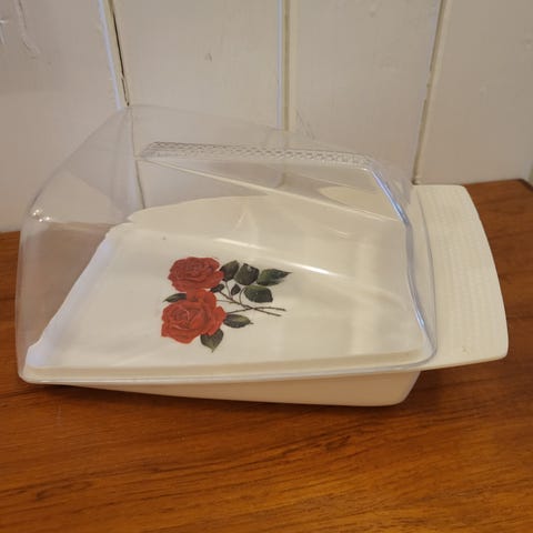Plast osteklokke fra 1970 tallet. Hvit bunn med hvitt lokk.