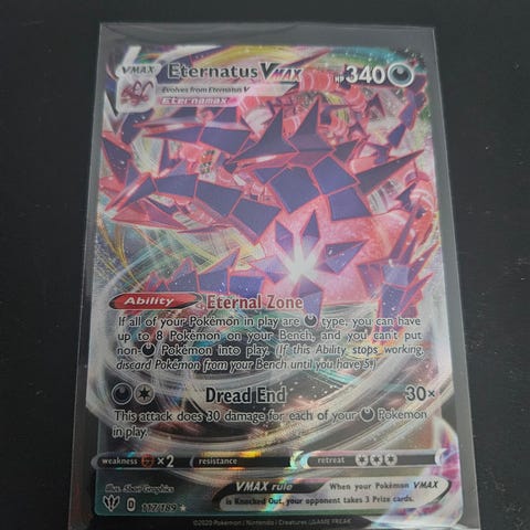 Eternatus Vmax fra settet Shining Fates selges. Kortet er i NM-M tilstand.