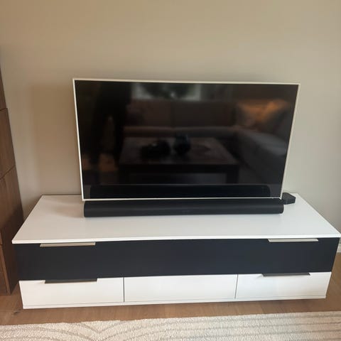 Tv, lydplanke og tvbenk samlet